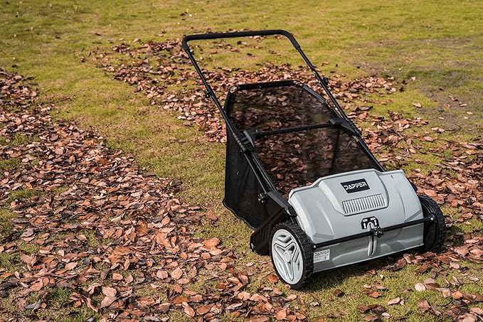 21-Inch Push Lawn Sweeper, Grass, Lawn and Leaf Cleanup Collector with Large 3.5 cu. ft. Hopper Bag, Durable Wheels, and Dual Spinning Brushes, Grey